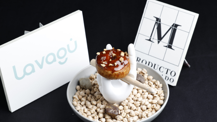 El acabado lo aporta una salsa elaborada con el propio jugo del guiso, enriquecida con mantequilla y cacao, y rematada con ralladura de lima y almendras. El resultado: una reinterpretación de los callos a la madrileña en formato de donut salado, que equilibra la intensidad del guiso tradicional con matices dulces, cítricos y tostados.