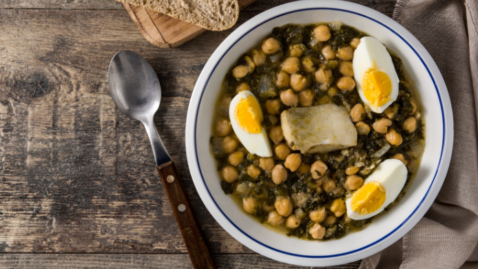Se trata de un plato de cuchara elaborado a base de garbanzos, espinacas, bacalao y huevo, pensado para respetar la tradición de no consumir carne durante la Cuaresma en sus últimos días. Un guiso nutritivo y reconfortante que aporta energía sin resultar pesado -no como esos que te tienen en el sofá toda la tarde-.