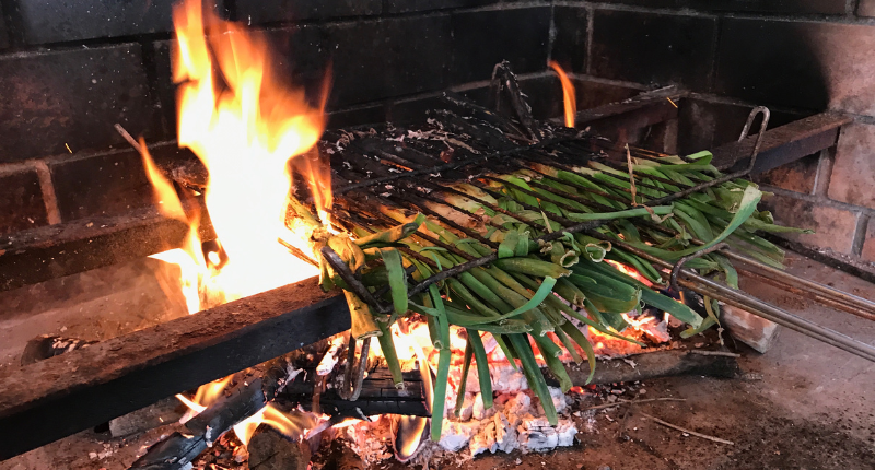 Cocinado con llama. Los calçots se asan tradicionalmente con leña de pino o sarmiento. Se preparan en paralelo en una parrilla doble y es importante meterlos al fuego en llama, no en brasa. El exterior debe quemarse (no te asustes cuando se ennegrezca la parte blanca) y el interior quedará jugoso cuando los deshojemos. Ya que el fuego arderá fuerte, dejaremos cada tanda unos 3 minutos por cada lado.